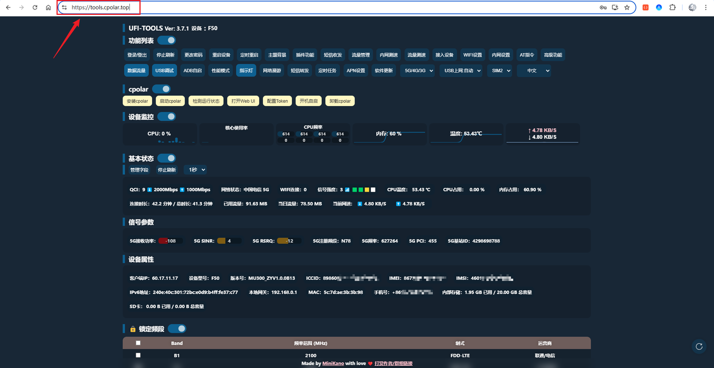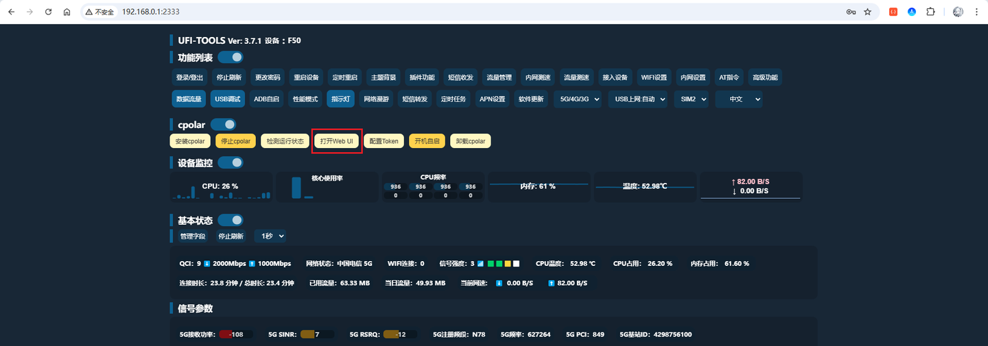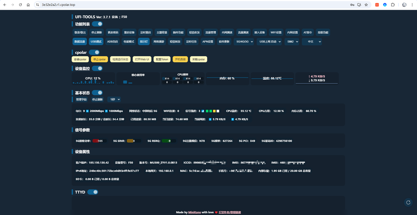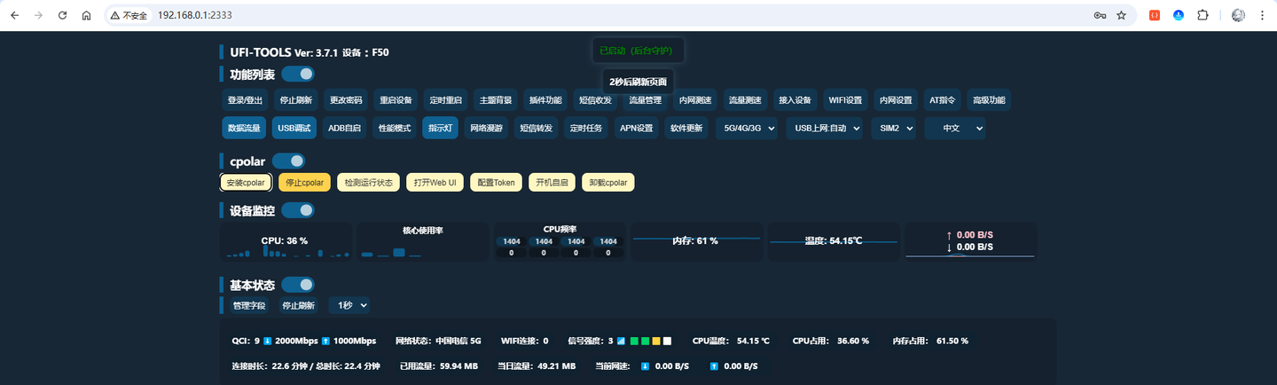 访问成功,且登录后可以正常获取F50设备的数据,至此,已将UFI-TOOLS工具通过固定二级子域名稳定映射到公网,一个永久不变的地址就设置完成啦!由于UFI-TOOLS已穿透至公网访问,建议将登录的密码修改为更强的口令,提升安全性!