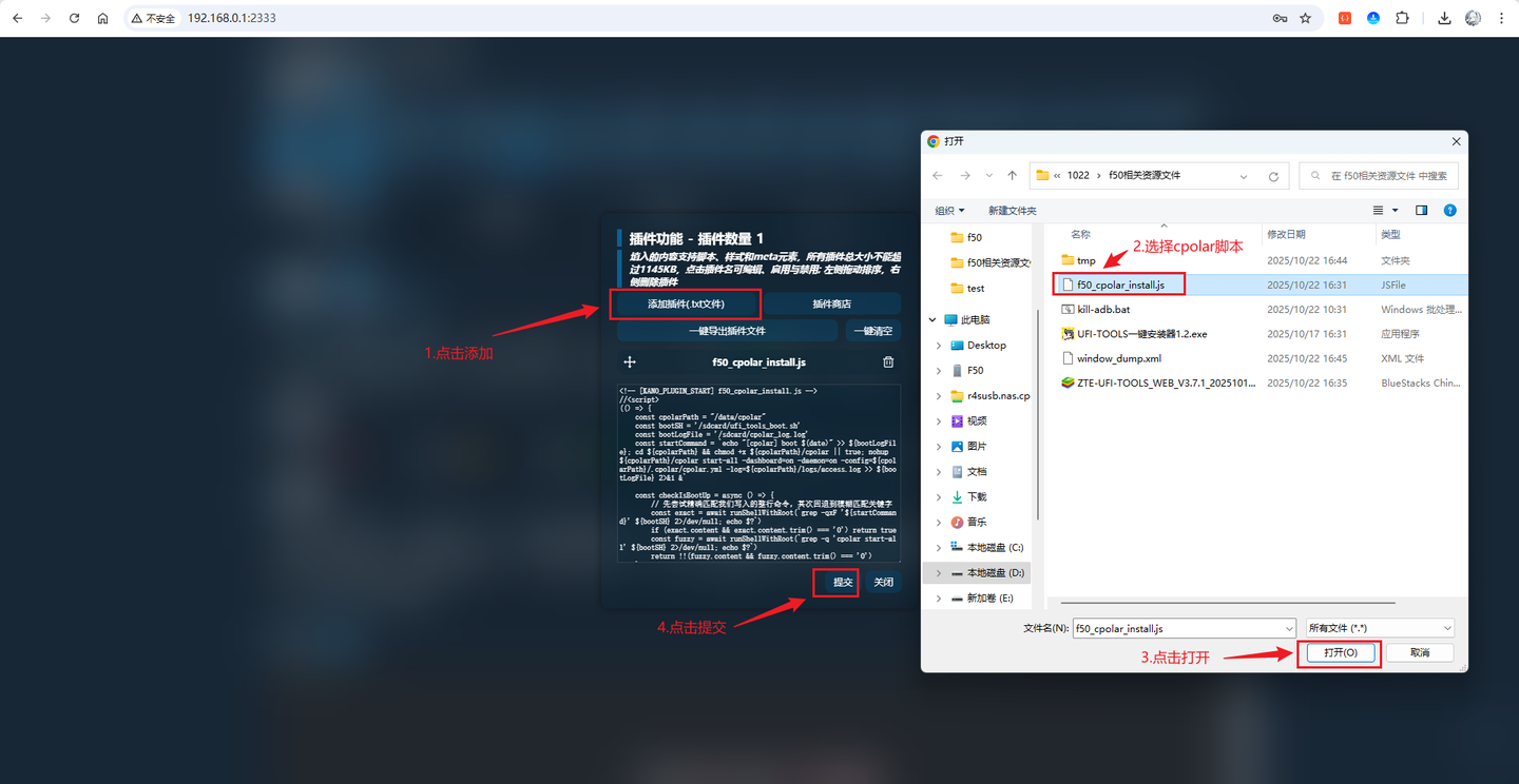 接下来点击添加插件,将f50_cpolar_install.js插件添加进来,然后点击提交: