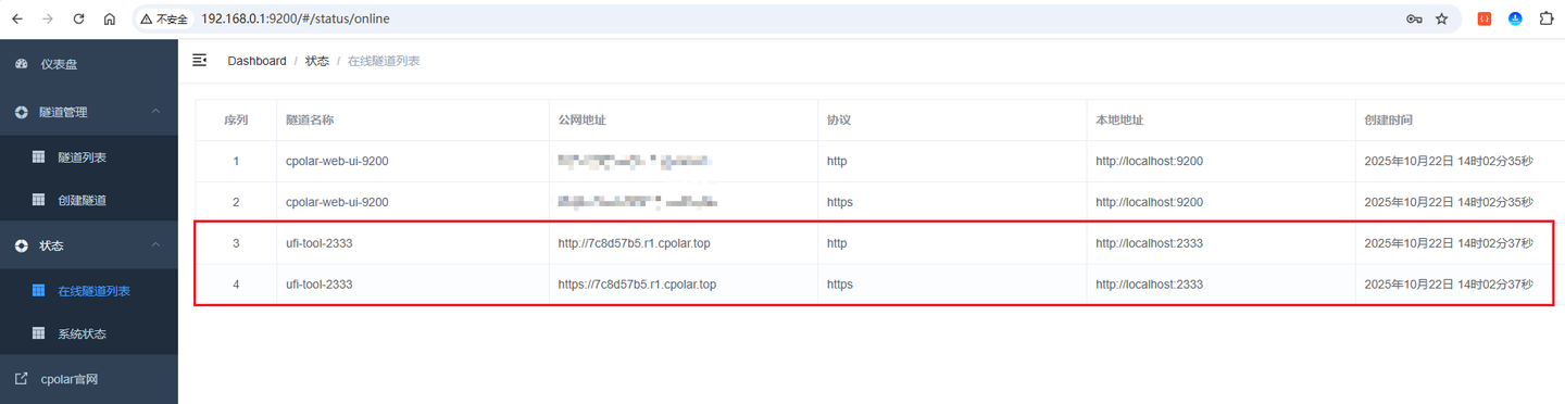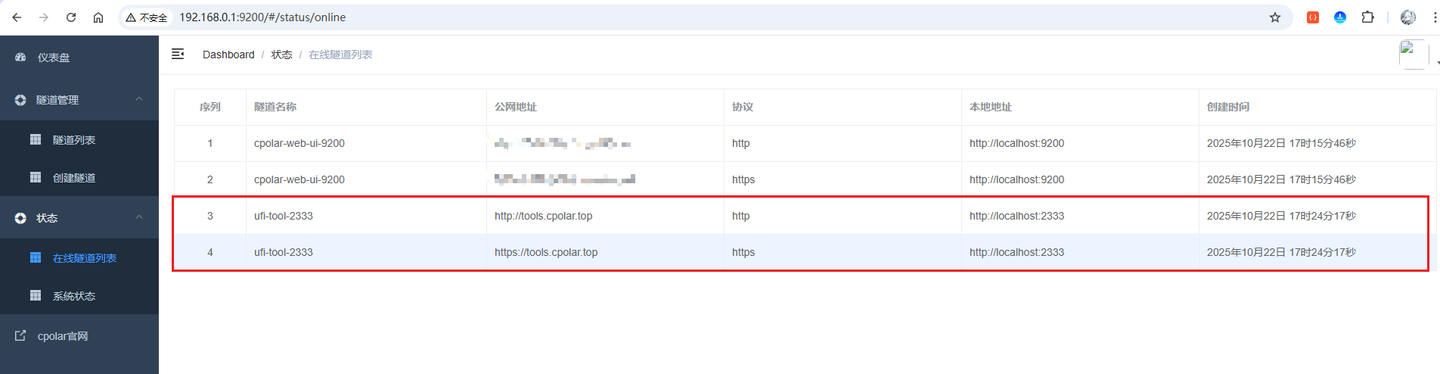 来到状态菜单下的在线隧道列表可以看到隧道名称为ufi-tool-2333的公网地址已经变更为二级子域名+固定域名主体及后缀的形式了: