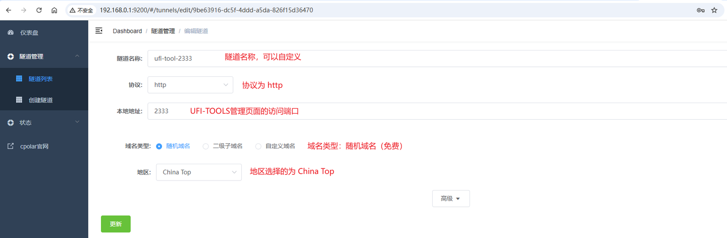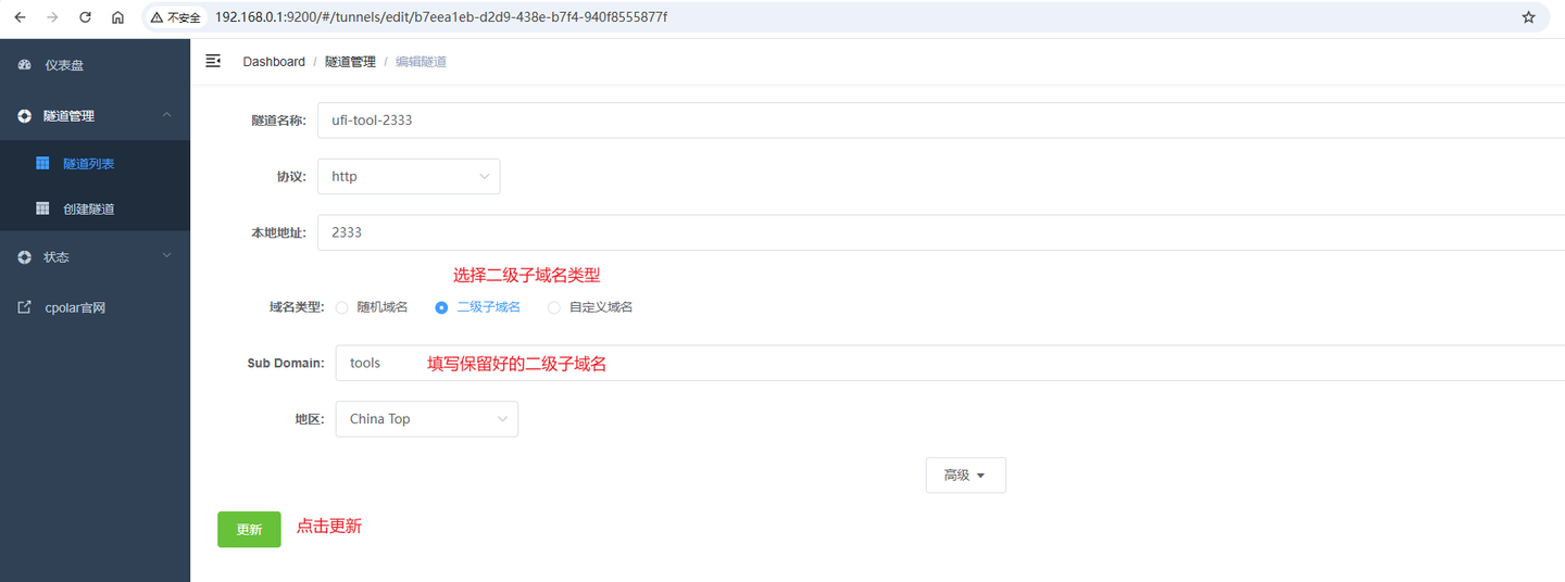 由于前面设置的为随机域名,随机域名的数据隧道处于临时状态(每24小时重置一次),大多用于测试场景。作为像UFI-TOOLS这样的管理页面,更适合长期访问,所以这里进行设置一个固定二级子域名,使其长期不变,方便记忆的域名。