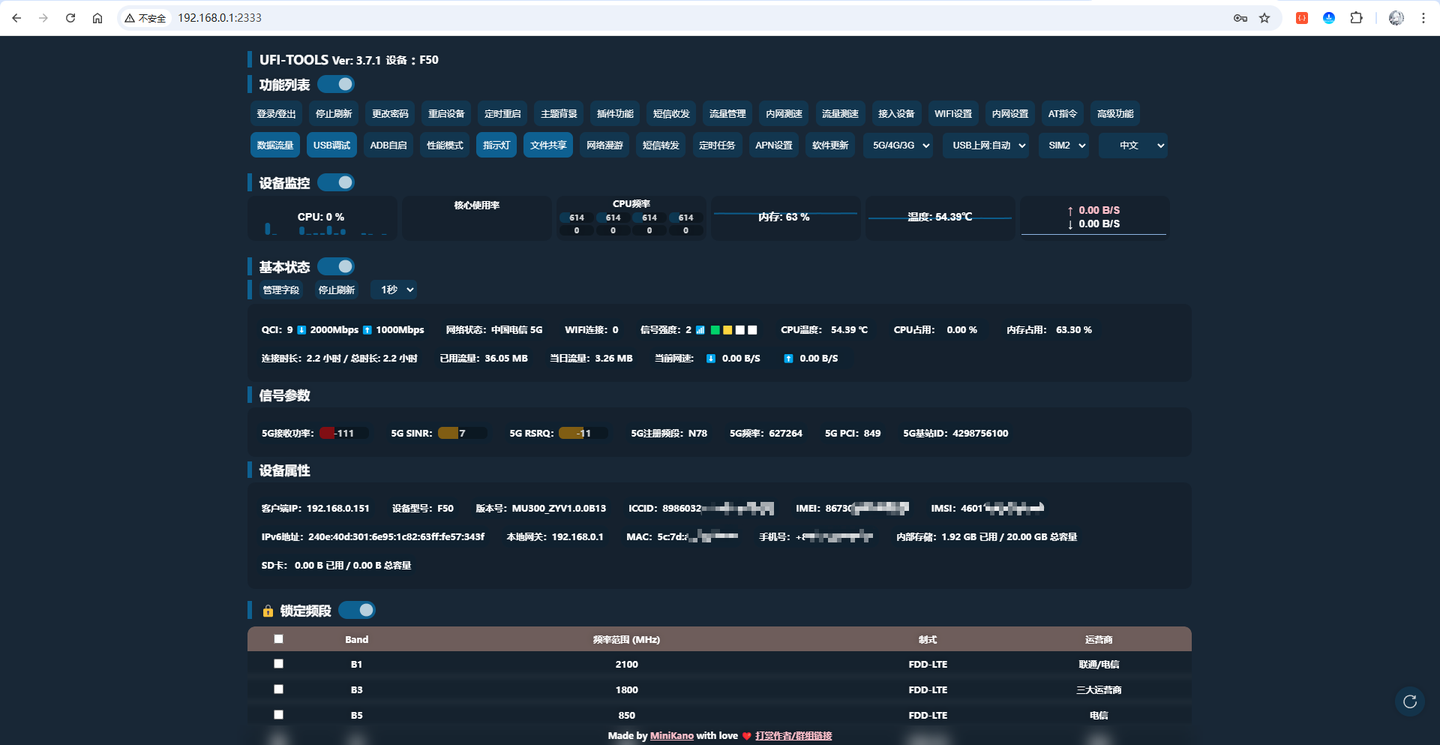 ZTE-UFI-TOOLS 是一款面向中兴 F50 随身 WiFi 的开源辅助软件,由网友 MiniKano 开发,主要用于扩展原厂固件的功能与可玩性。它支持通过 Web 界面或手机 App 查看设备的实时状态(如信号强度、温度、CPU 占用、IPv6 地址等),并可实现锁频段、锁小区、USB 调试、网络 ADB 调试、远程管理、文件共享开关、指示灯控制、性能模式切换等操作。方便用户远程维护和优化随身 WiFi 的网络表现。