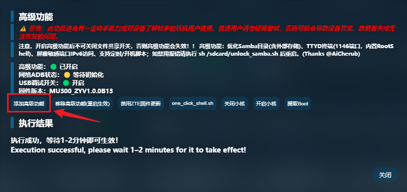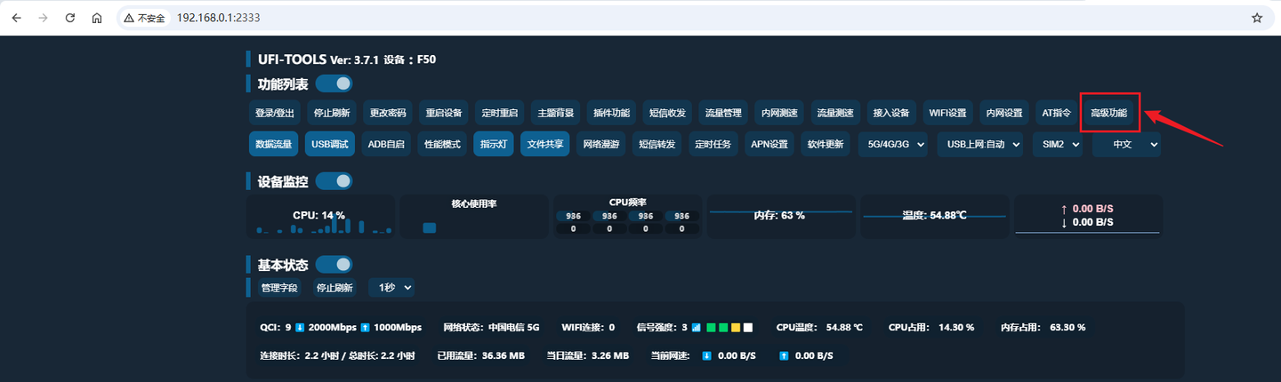 首先,UFI-TOOLS管理页中点击高级功能按钮(如果为灰色,请左上角登录/登出按钮进行登录你的随身wifi):