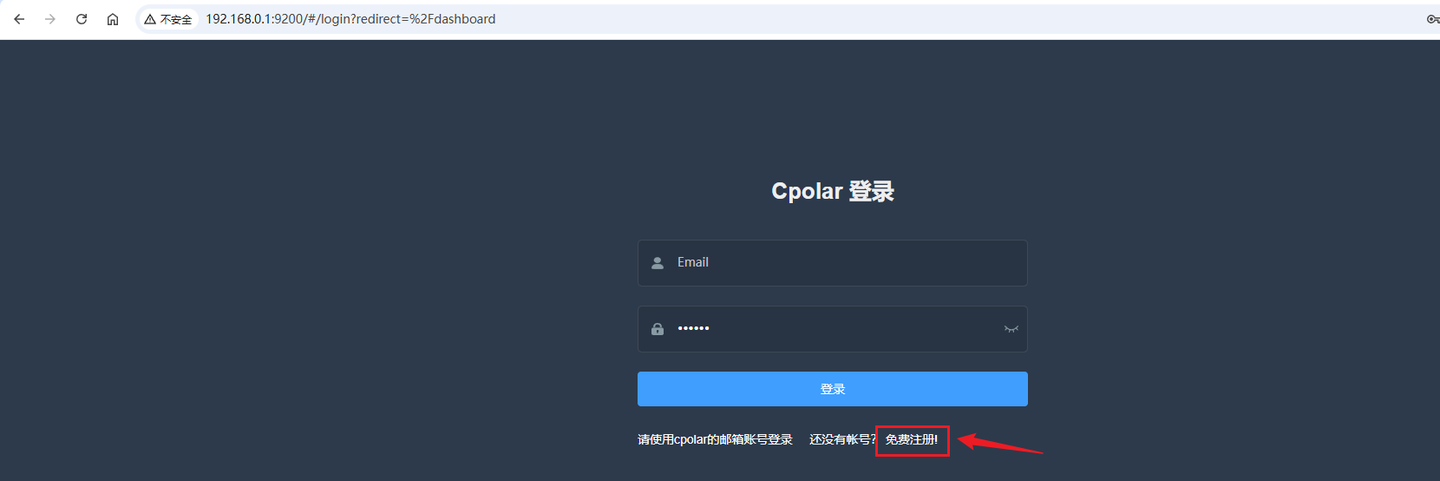 会跳转打开cpolar 的web ui的后台管理界面,如果还没有账号,也可以直接在该页面跳转注册页面注册账号: