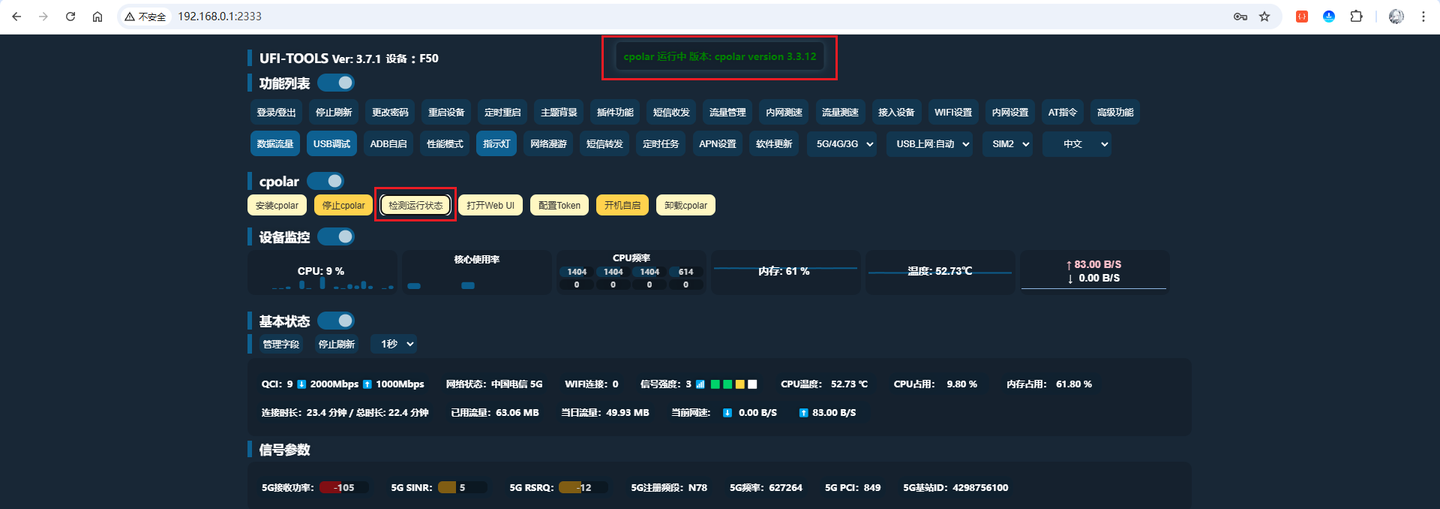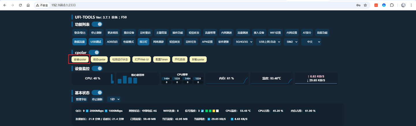 http://192.168.0.1:2333/验证页面可用。部署 cpolar 插件并启动:在 UFI-TOOLS 启用高级功能,导入