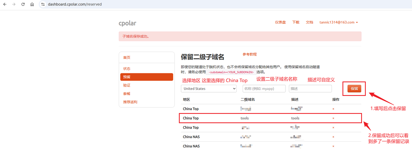 https://dashboard.cpolar.com/reserved然后在预留页面的保留二级子域名中,创建一条二级子域名记录,操作如下图: