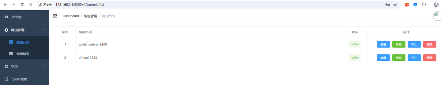 注:二级域名是唯一的,每个账号都不相同,请以自己设置的二级域名保留的为主接下来,进入侧边菜单栏的隧道管理下的隧道列表,可以看到名为ufi-tool-2333的隧道: